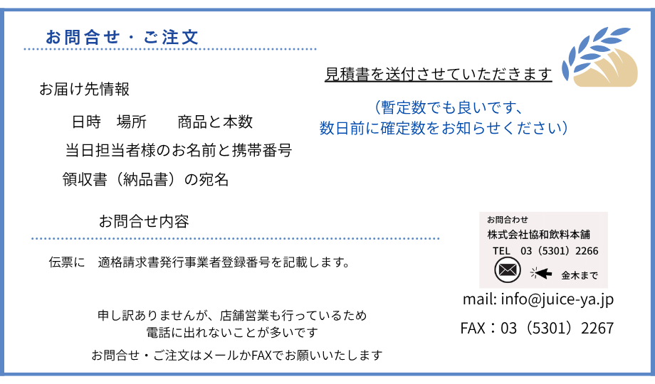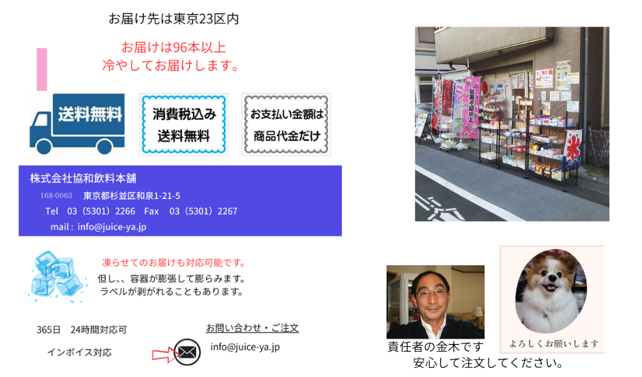 info@juice-ya.jp お店を始めたため(駄菓子屋)電話に出れないことが多いです。 FAXでの問合せ・ご注文がありがたいです。