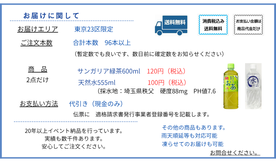 セミナー イベント 運動会 日時指定で 冷やしたお茶・お水を配達します。